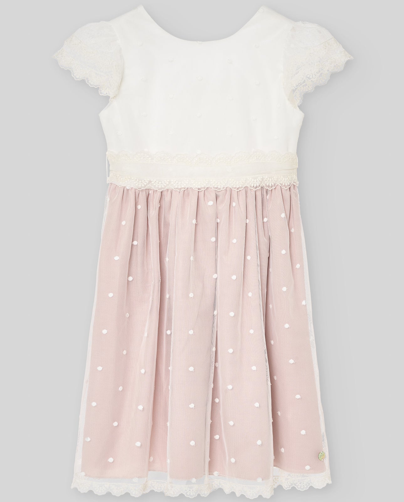 Vestido infantil de tul bicolor con cuerpo bordado y banda de tejido en la cintura que se ata con lazada en la espalda. Prenda ligera y elegante con un aire sofisticado de ceremonia.