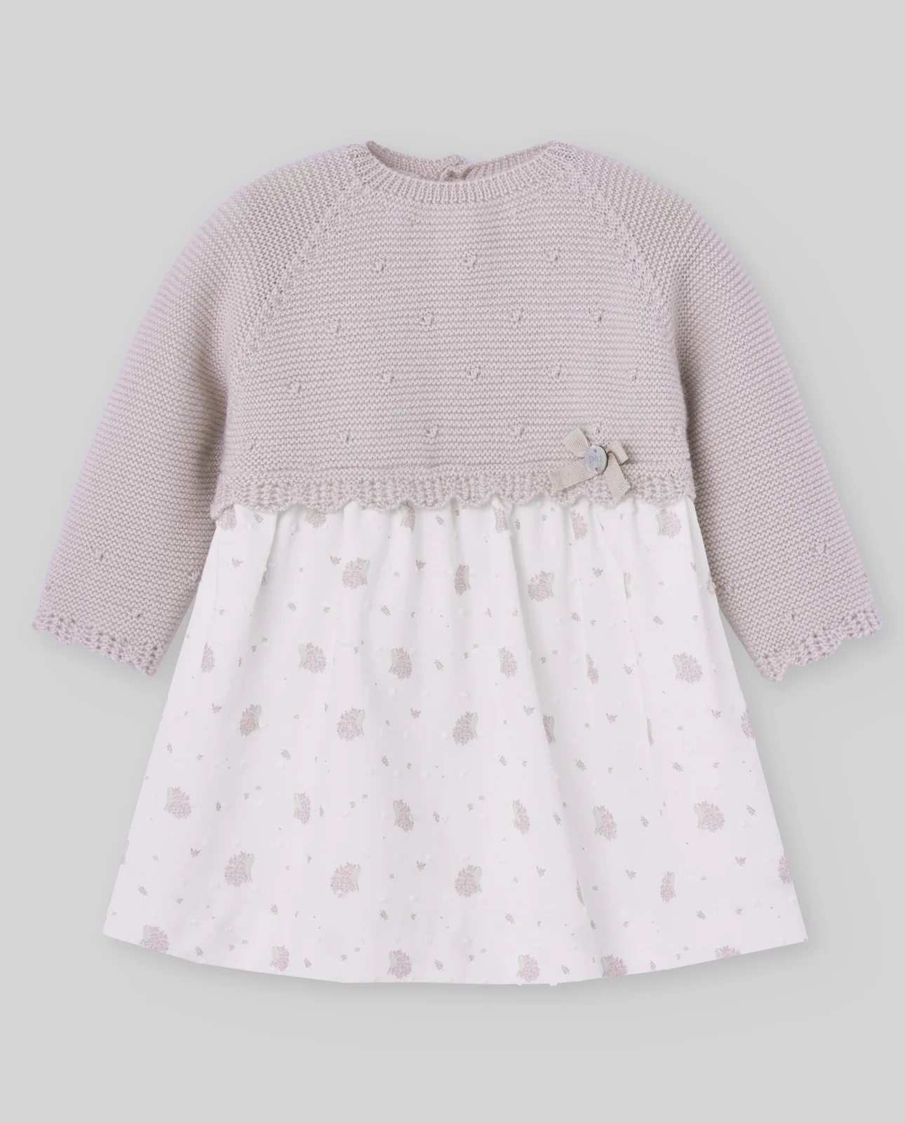 Vestido de algodón estampado con motivos infantiles. Corte evasé con cuello volante, rematado con puntilla, y manga larga con puños fruncidos. Lazo decorativo y botones en el delantero.