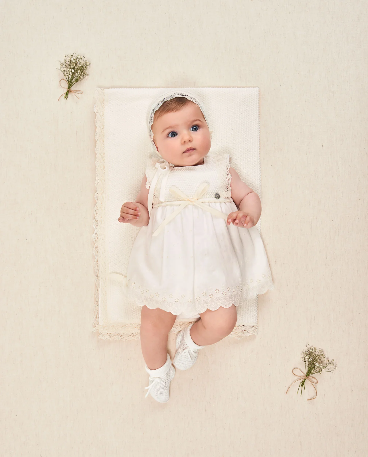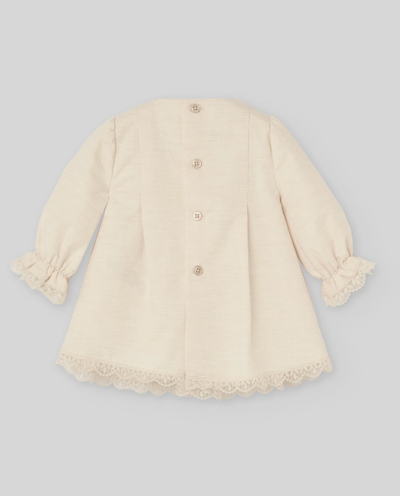 Vestido para bebé niña ideal para su bautizo, ceremonia o eventos especiales en punto y tela. Tejido de tul bordado rematado en flores bordadas y ondas. Sin mangas. Pechera trabajada en punto, puntillas y una lazadacentral en cinta de raso a tono. Chapita de nácar PAZ RodrÃguez. Cierre trasero con botones a tono.