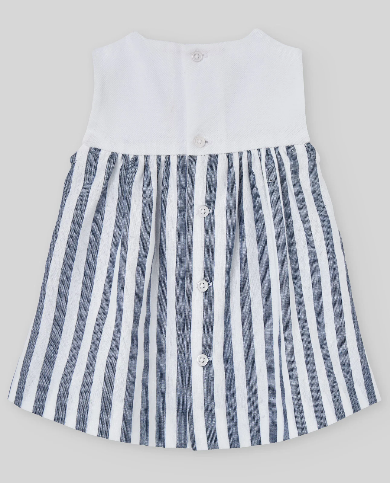 Vestido de lino para niña con bordado artesanal en tonos azul cielo sobre el canesú y pequeño lazo decorativo. Su diseño sin mangas y el tejido ligero lo convierten en una prenda perfecta para los días más cálidos de primavera y verano, ideal para ocasiones especiales o eventos familiares.