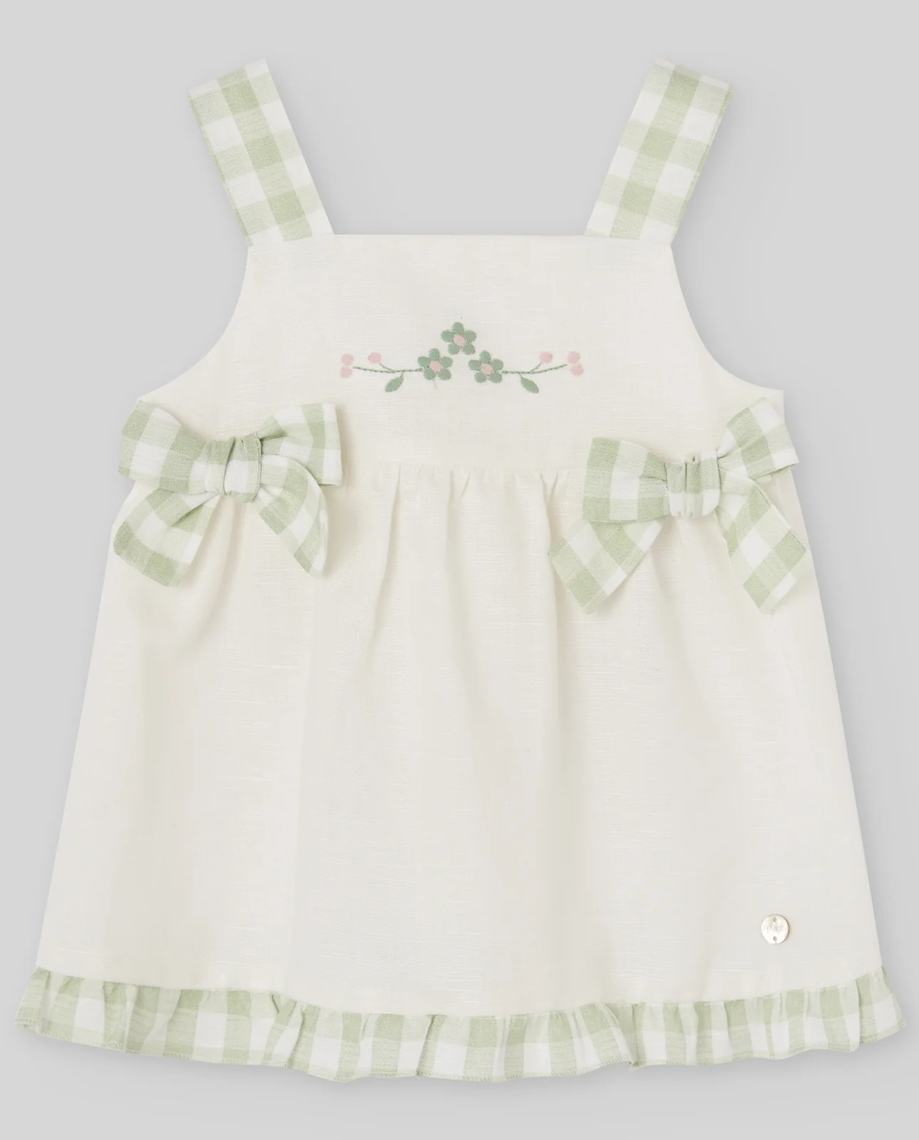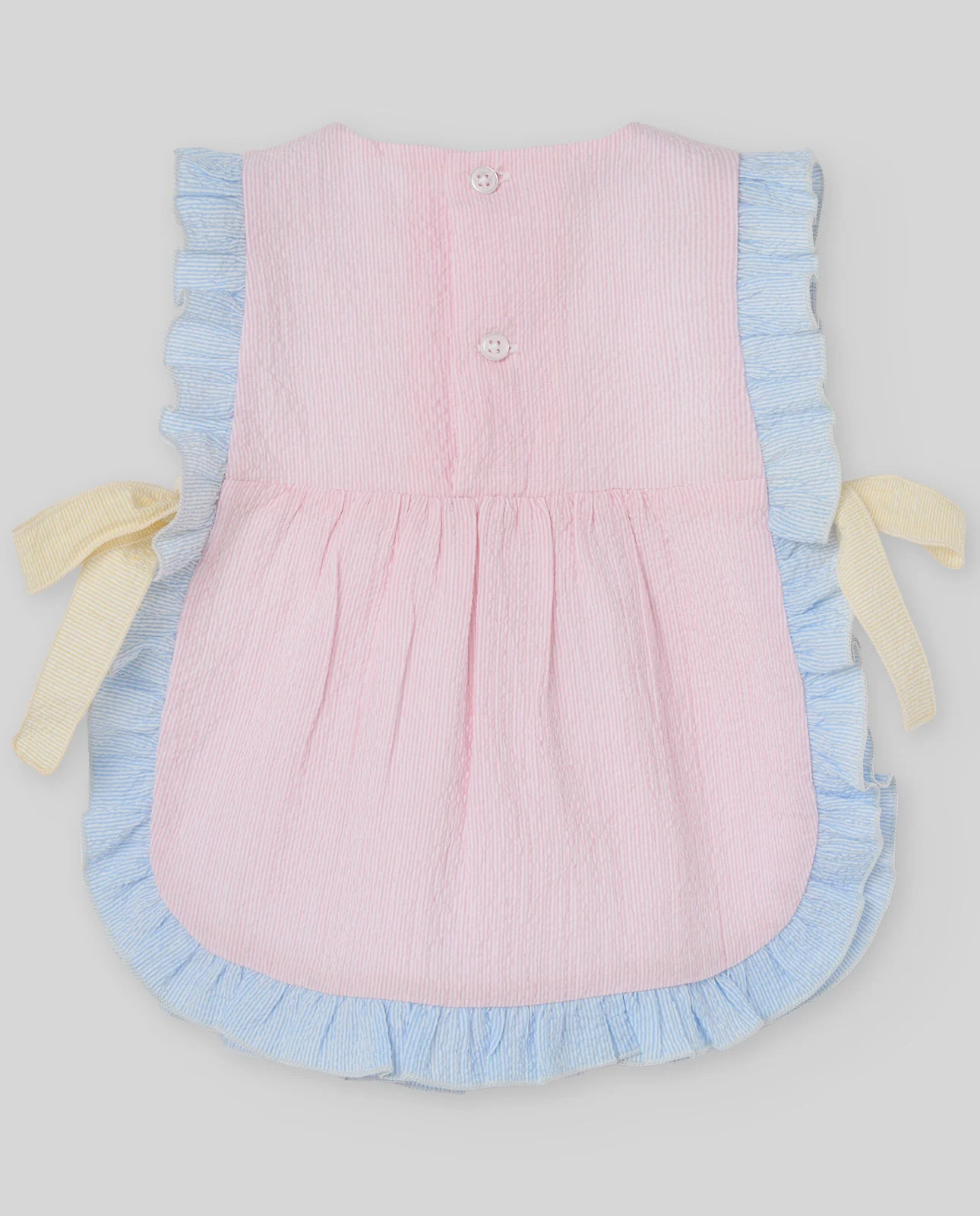 Vestido para niña en tejido seersucker multicolor, con volantes a contraste en azul y lazos amarillos laterales. Su textura ligera y aireada proporciona comodidad y movimiento. Es una opción divertida y original para el día a día o para lucir en ocasiones especiales al aire libre.