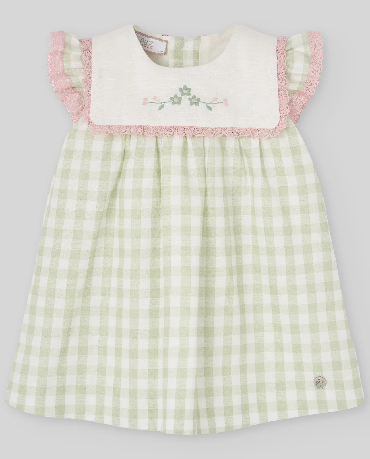 Vestido para bebé niña de cuadros con canesú bordado y volantes en las mangas. Confeccionado en tejido suave y ligero, aporta un estilo delicado y natural ideal para los días más cálidos.