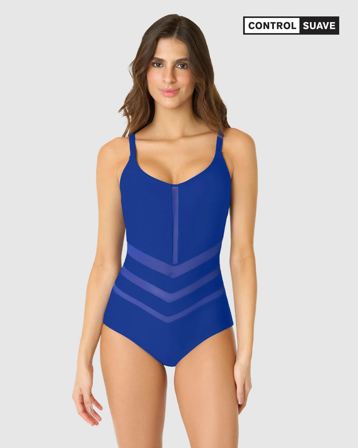 Este vestido de baño genera control en tu abdomen bajo para que esta zona de tu cuerpo se vea más libre de rollitos. Su diseño con tul en forma diagonal da un efecto visual de una cintura más definida. Su espalda es anudable para que puedas ajustarlo a tu medida, también tiene copas fijas que dan una modelación más redondeada y un elástico bajo el busto para mejor soporte. Sus cargaderas son ajustables para que las adaptes a tu medida.