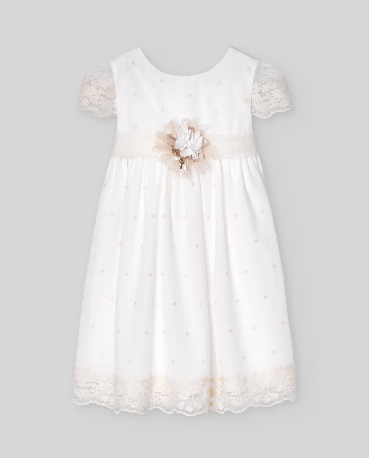 Vestido para niñas, ideal para ceremonias y eventos especiales. Confeccionado en una delicada combinación de tul bordado y tejido de algodón, cuenta con mangas cortas abullonadas y sutiles bordados florales en las mangas y el bajo. El diseño está adornado con pequeños topitos distribuidos por todo el vestido. Incorpora un cinturón con lazo y detalle floral en la cintura, así como un lazo adicional en la espalda. Escote en pico en la parte trasera y cierre de botones para facilitar el ajuste.