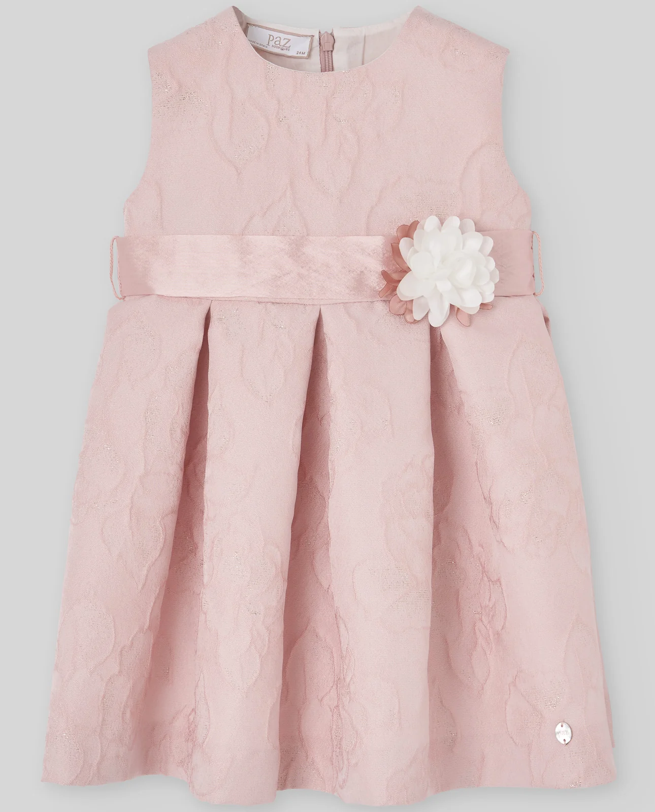 Vestido jacquard de diseño clásico con falda de pliegues y cinturón con flor aplicada. Un modelo de ceremonia elegante y atemporal, ideal para celebraciones de primavera y verano.
