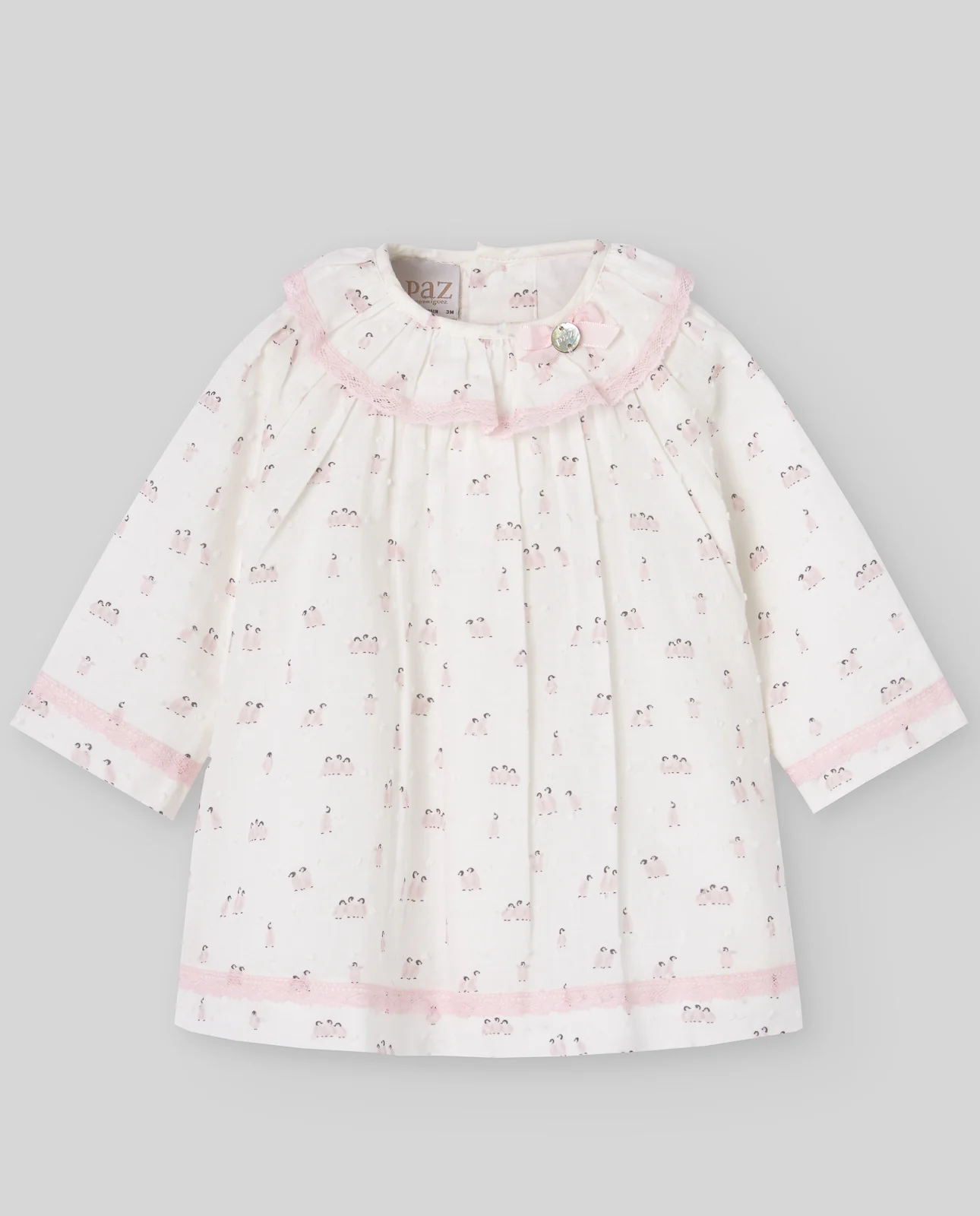 Vestido para bebé niña de manga larga, elaborado en tejido plumeti con un encantador estampado de pingüinos. Presenta un delicado detalle de puntillas en tono rosa pastel. El cuello redondo tiene un remate de volante en el mismo tejido. Se destaca un lacito adornado con una placa de nácar de la marca PAZ Rodríguez. El cierre trasero se realiza con botones a juego.