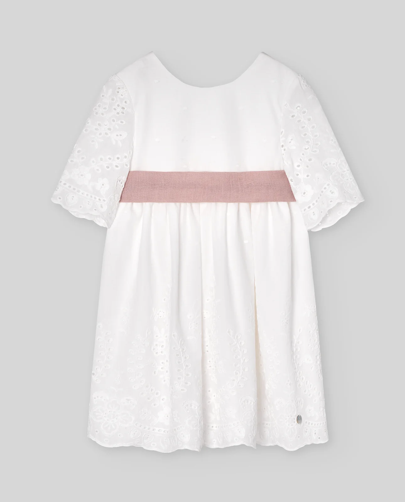 Vestido de manga francesa en tejido bordado con escote a la caja y banda a contraste en la cintura.