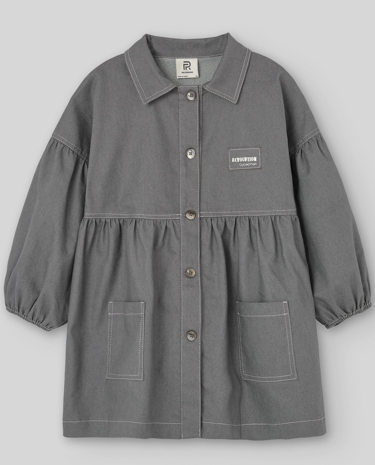 Vestido camisero corto en sarga técnica. Abertura delantera con botones y corte con frunce en cintura. Manga larga con goma en puños y pespuntes a contraste.