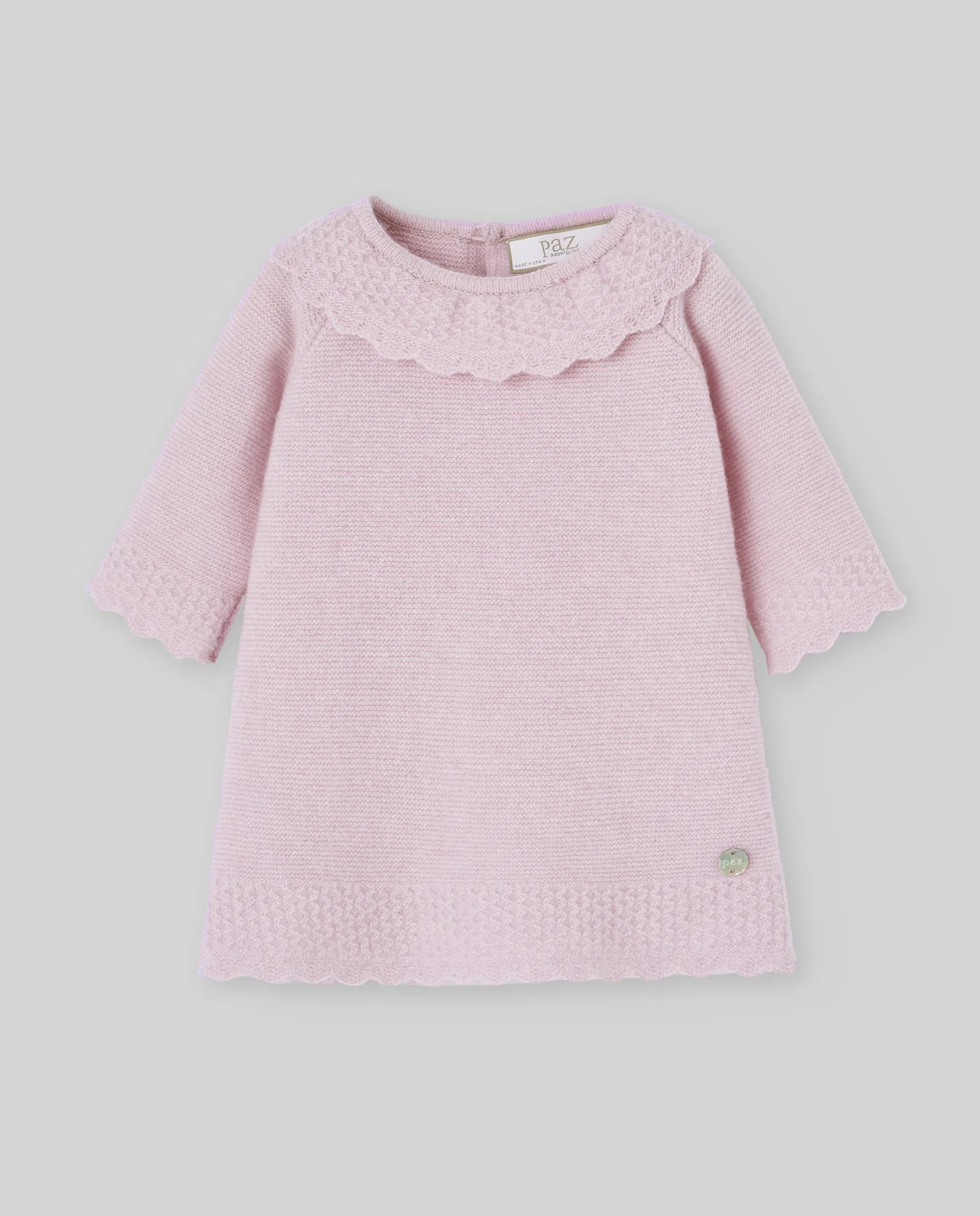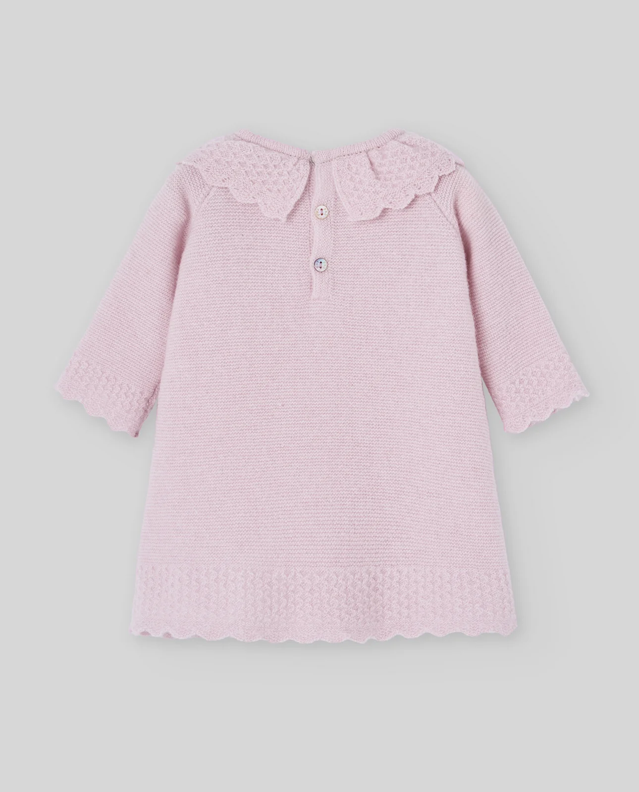 Vestido de punto liso en mezcla de lana y cashmere. Diseño recto con cuello trabajado y detalles en punto estructurado en bajo y puños, que aportan un toque delicado y elegante.
