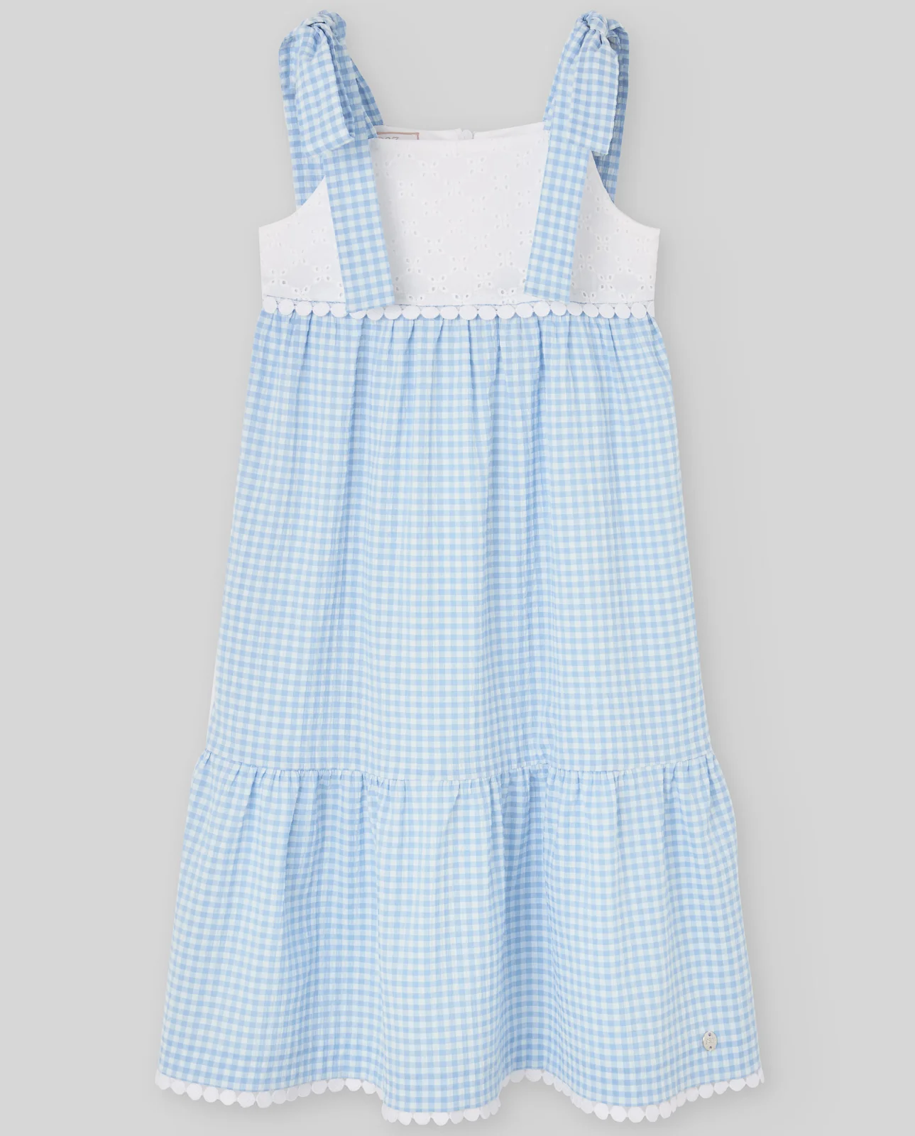 Vestido largo para niña de cuadros con tirantes anudados y cuerpo bordado. Su silueta amplia y vaporosa lo convierte en una opción ideal para ocasiones especiales o eventos al aire libre.