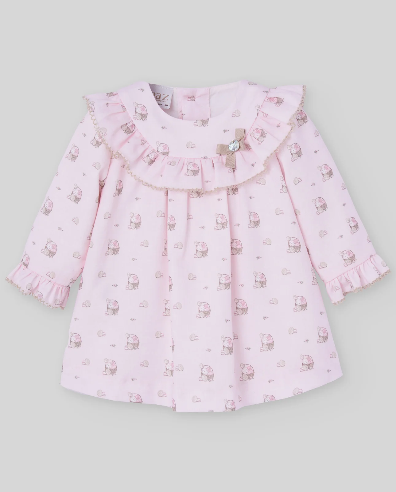 Vestido estampado con volantes en el escote y manga larga. Detalle decorativo en el pecho y cierre trasero con botones.