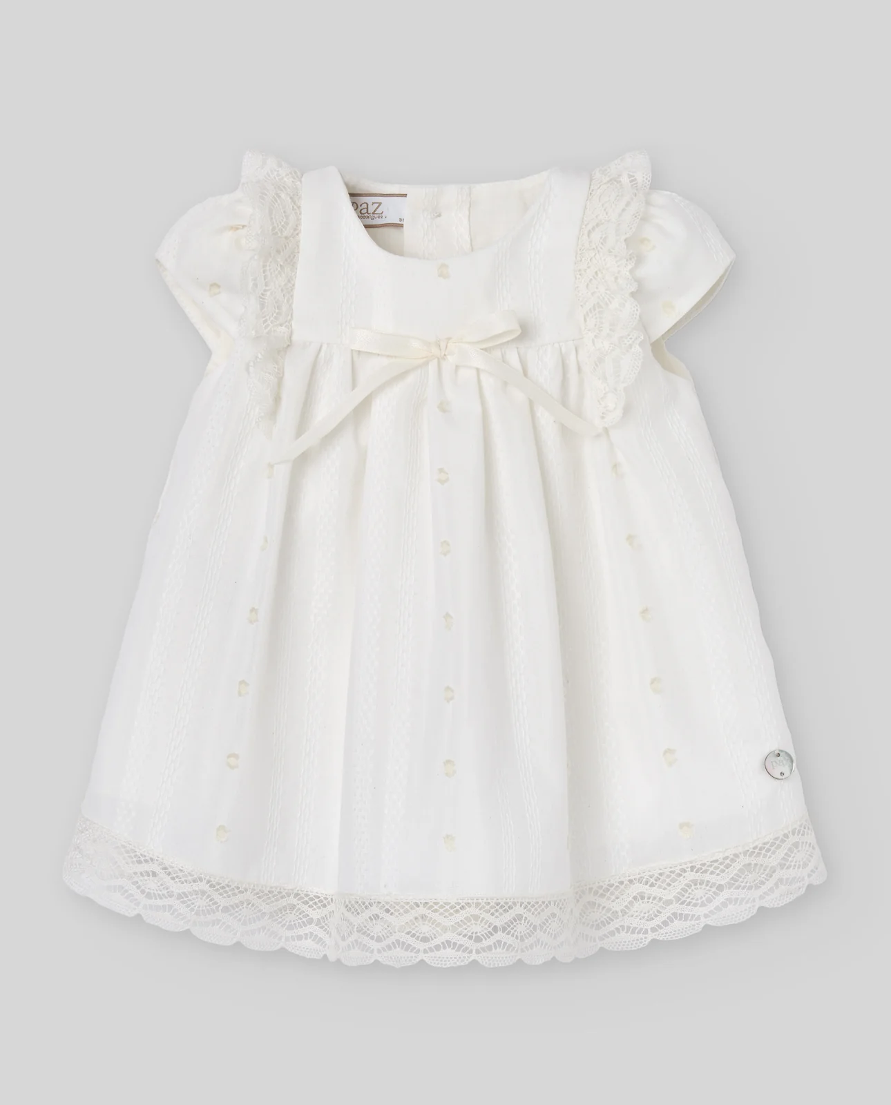 Vestido de lino para bebé, diseñado para bautizo o ceremonia. Con volantes y encajes delicados, transmite pureza y elegancia en cada detalle.