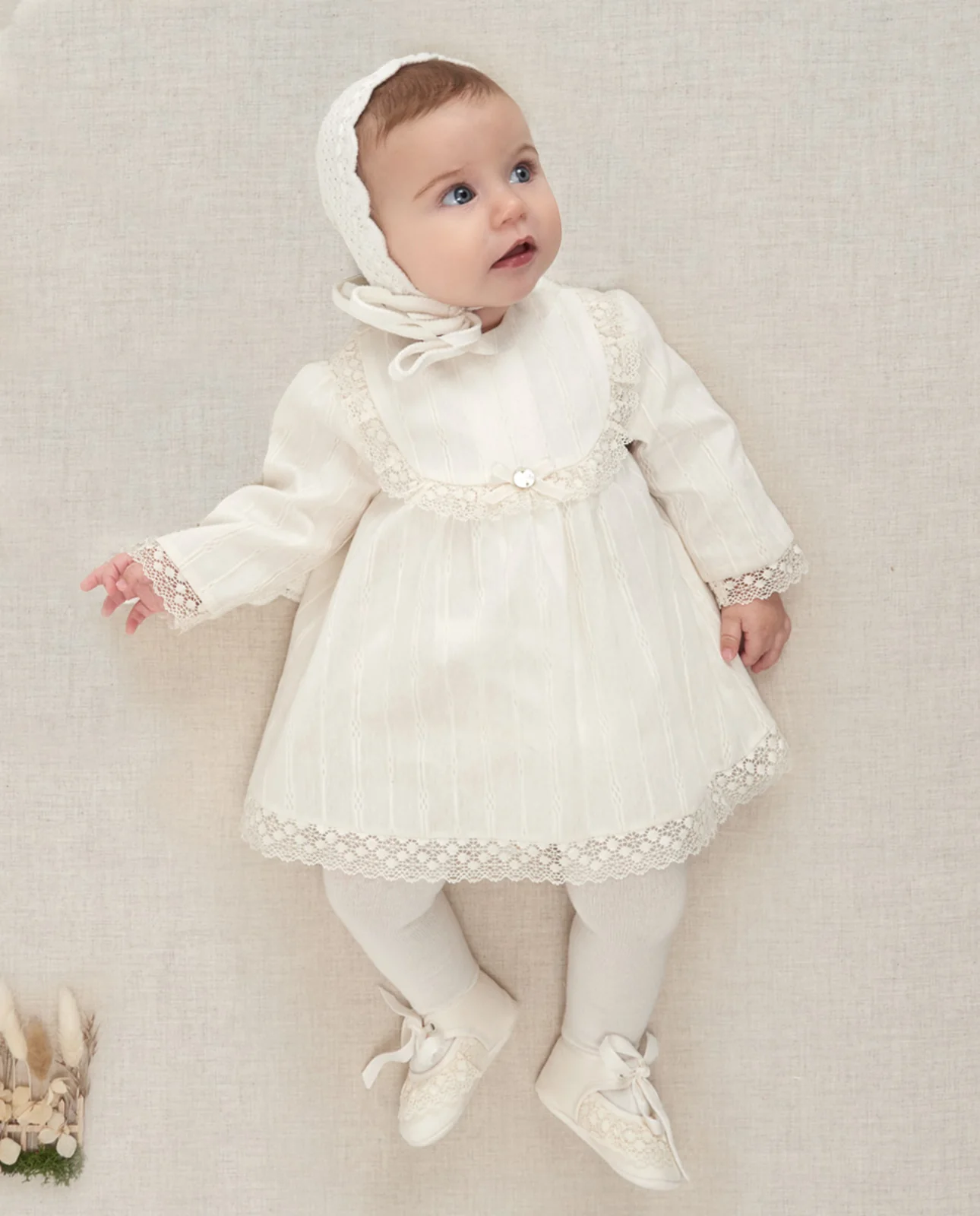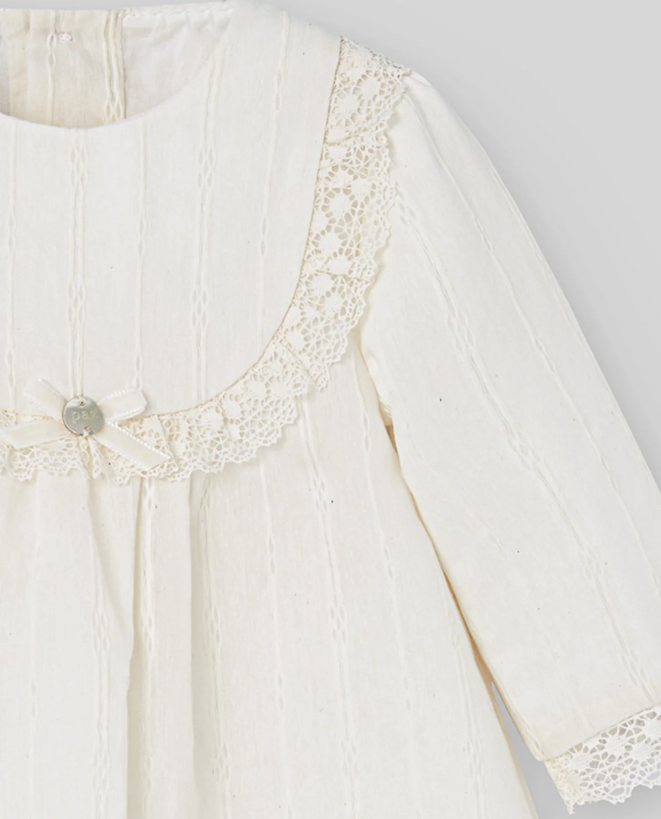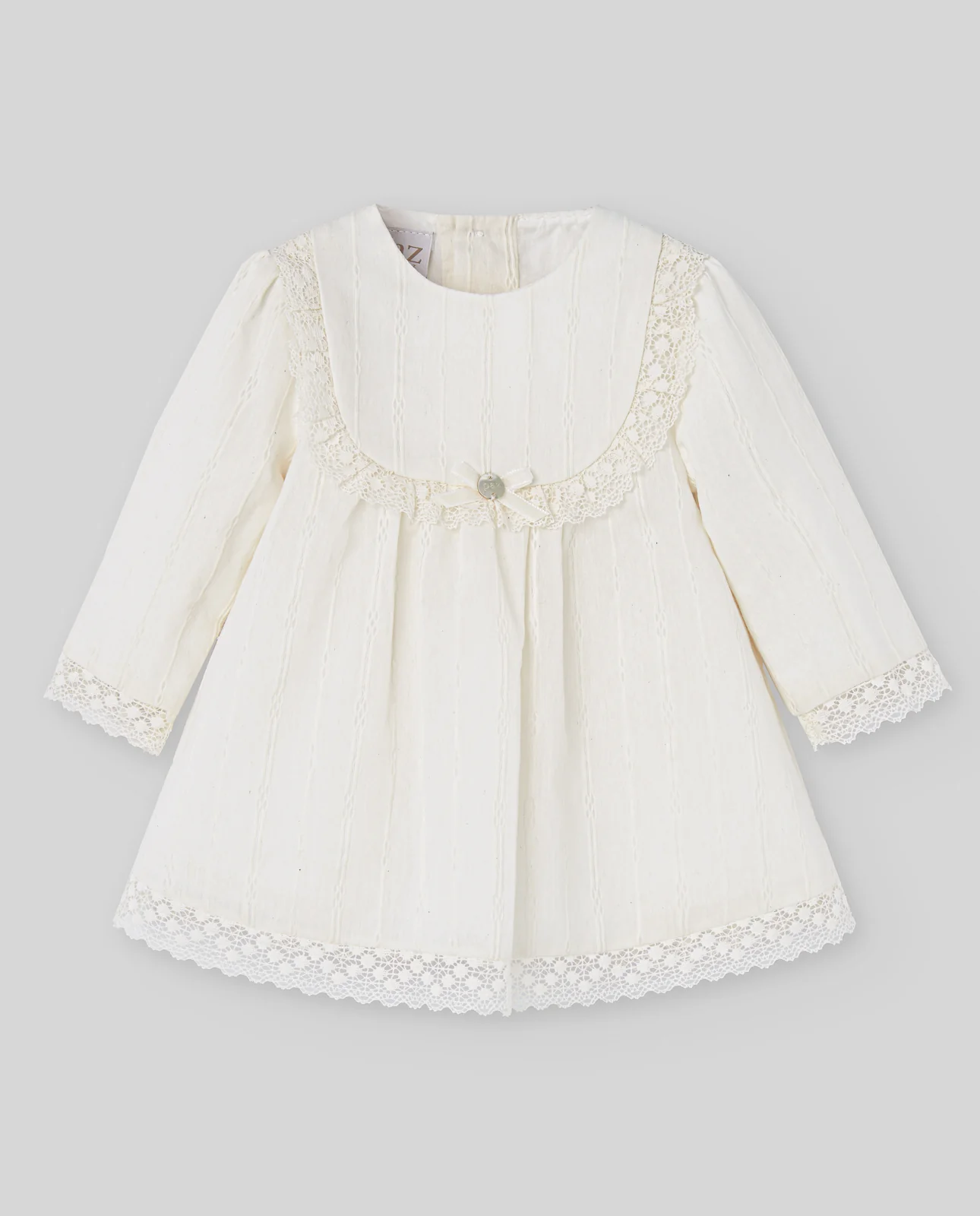 Vestido de jacquard con textura geométrica. Cuello redondo con bordado, nido de abeja en el delantero y lazo decorativo. Manga larga y cierre con botones en la espalda.