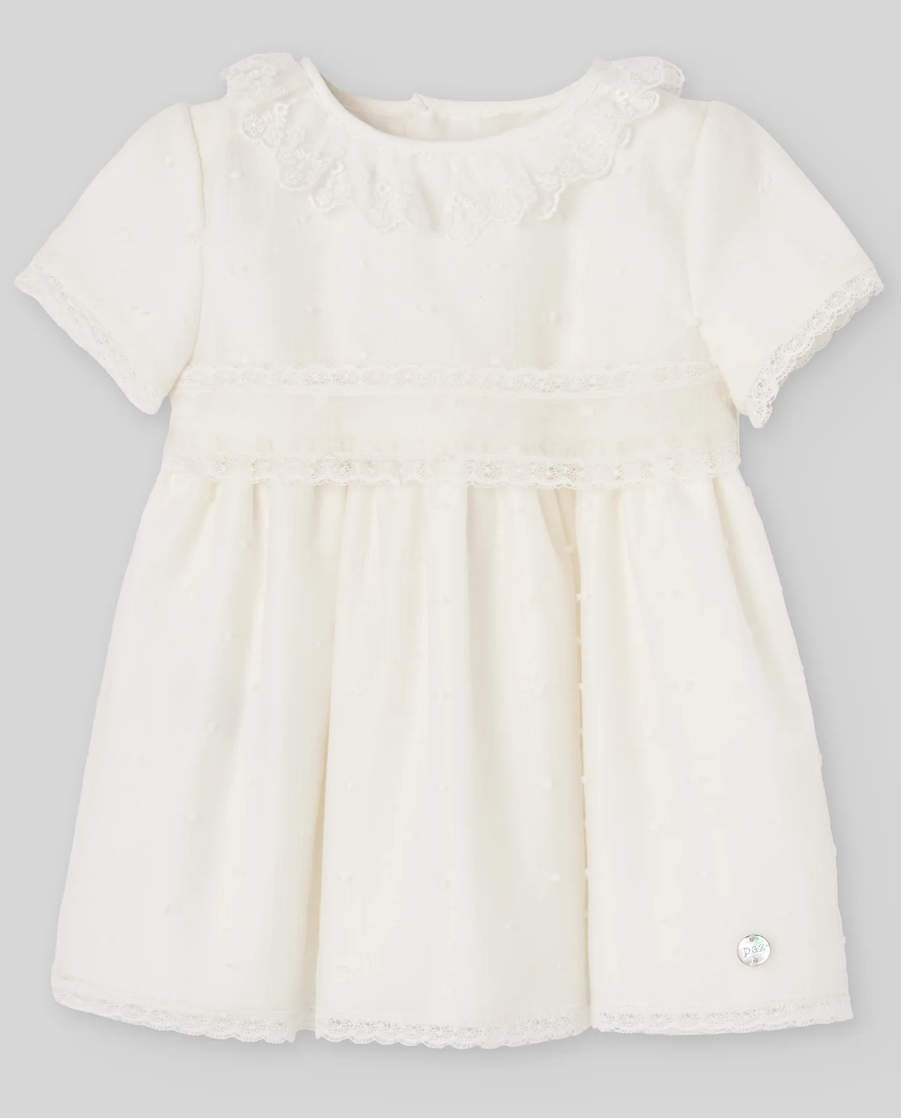 Vestido de organza plumeti con falda vaporosa y delicados detalles de encaje. Un diseño lleno de encanto y elegancia pensado para los días más señalados.