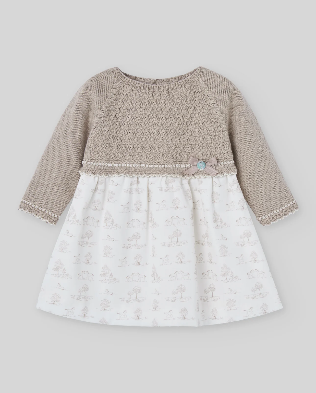 Vestido con cuerpo en punto liso y falda en tejido espigado. Cuello con volante, nido de abeja bordado y lazo a contraste. Manga larga y cierre trasero con botones.