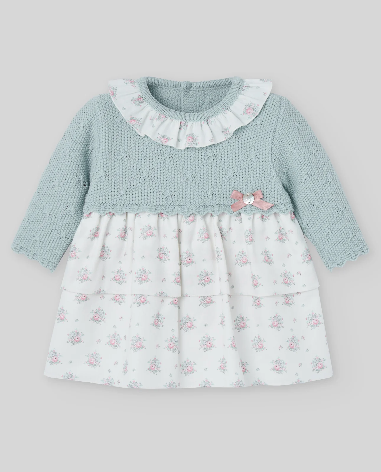 Vestido de tejido estampado con cuerpo en punto. Cuello redondo, detalle de nido de abeja bordado en el pecho y manga larga. Lazo decorativo y cierre trasero con botones.