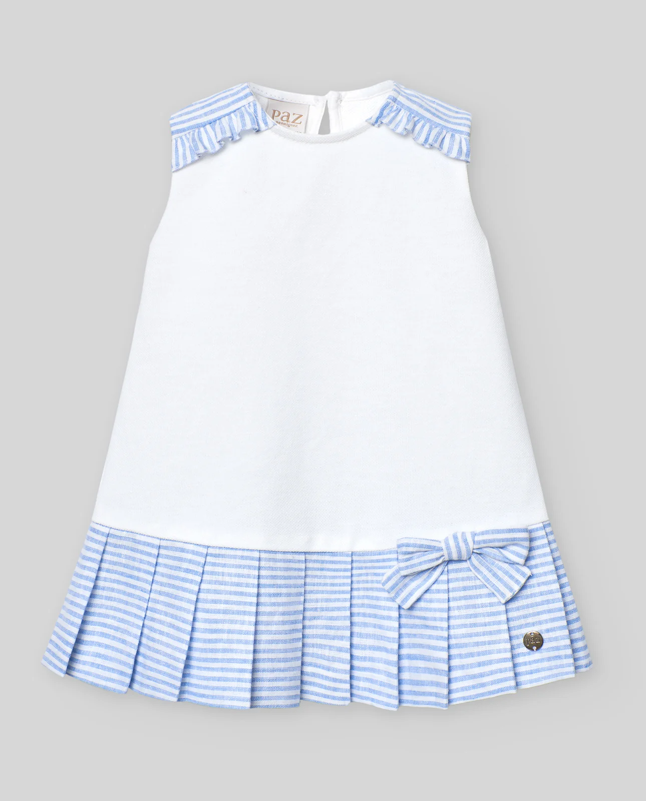 Vestido combinado con tejido de rayas bicolor blisado en bajo y hombros.