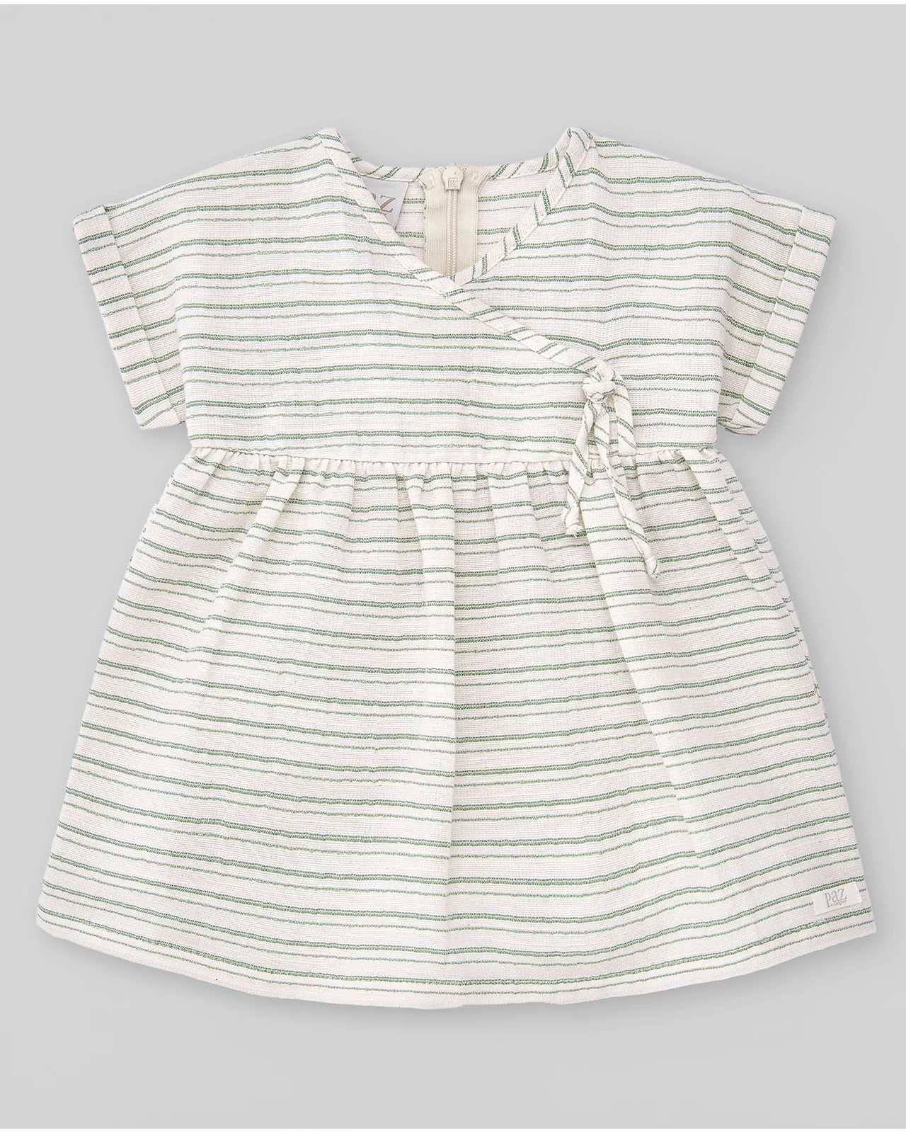 Vestido para bebé niña en tejido rústico, con detalle cruzado en la parte delantera. Manga corta y estampado a listas. Cierre trasero con cremallera oculta.