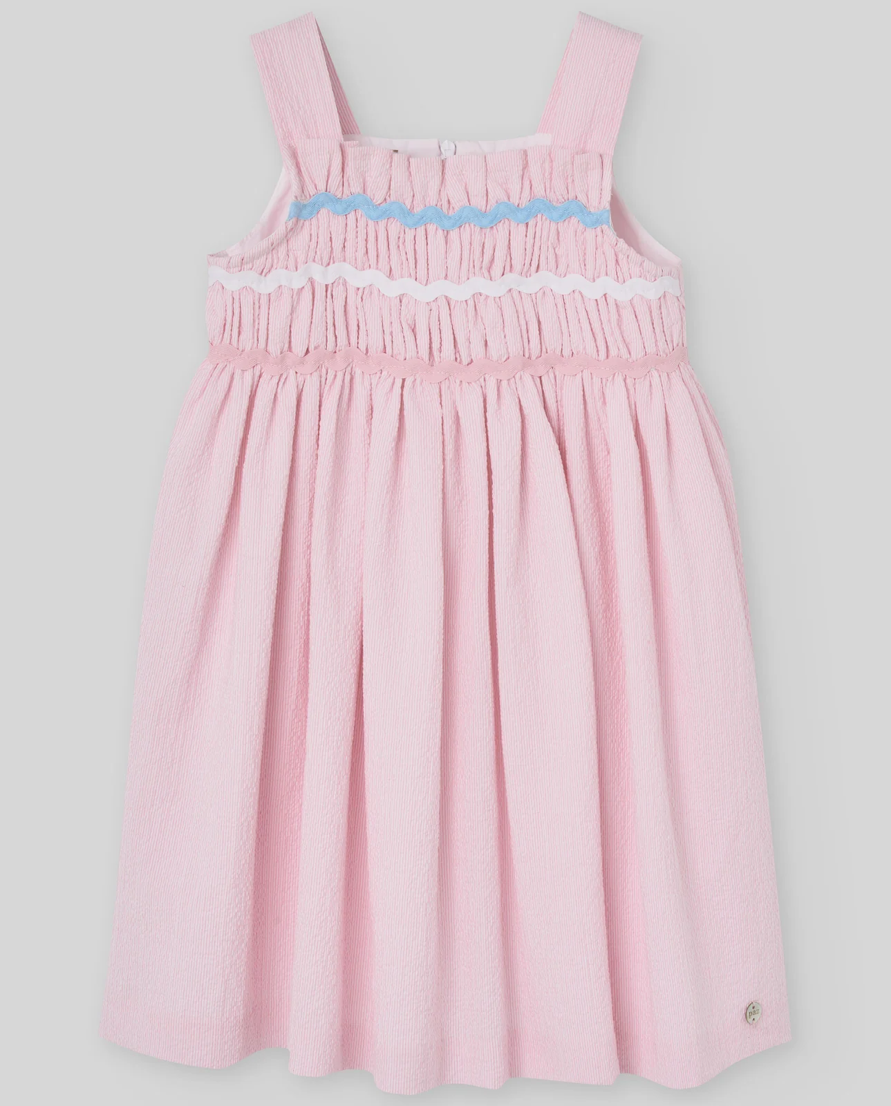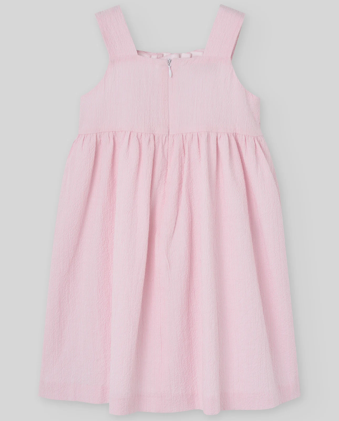 Vestido infantil para niña confeccionado en seersucker con cuerpo fruncido y detalles ondulados. Un diseño alegre y cómodo que aporta movimiento y un estilo clásico con toque moderno.