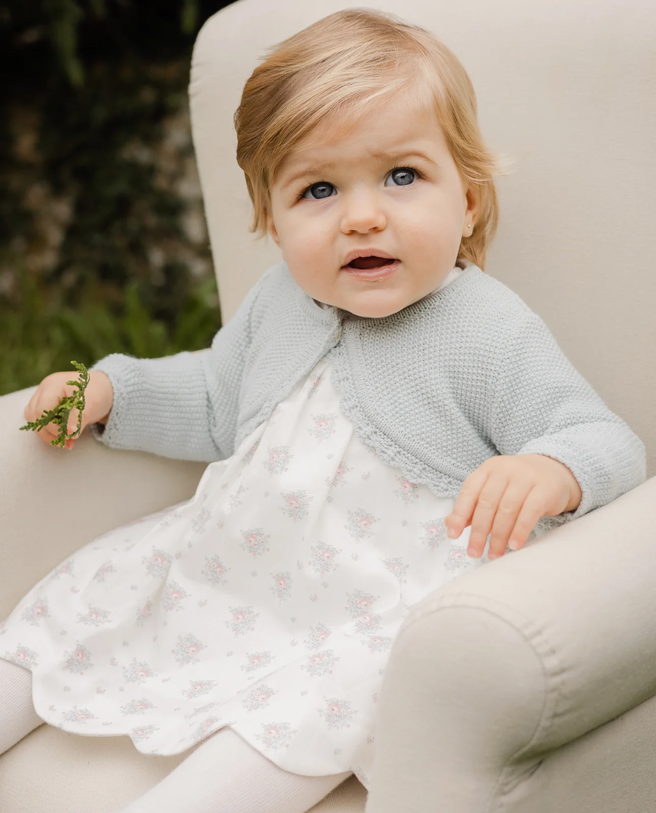 Vestido estampado con flores pequeñas. Cuello redondo con nido de abeja bordado, manga larga con puños fruncidos y lazo decorativo. Corte evasé y cierre con botones.