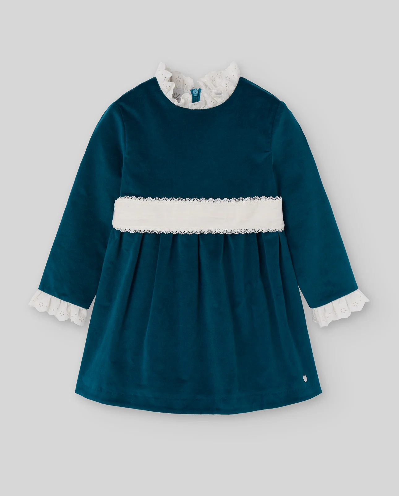 Vestido de ceremonia en velvetón con detalle de puntilla en cintura y cuello. Manga larga con frunce y falda con vuelo. Cierre trasero.