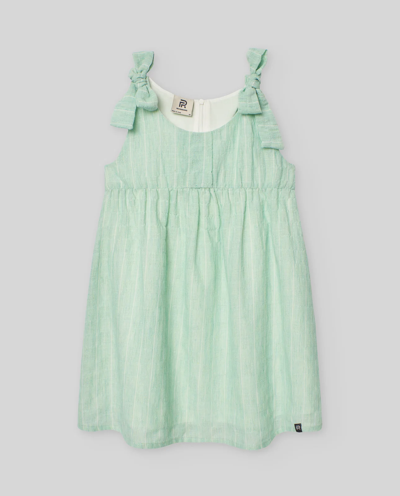 Vestido corto en tejido de rayas a tono con tirantes y lazadas en hombros. Corte en cintura y cierre con cremallera espalda.