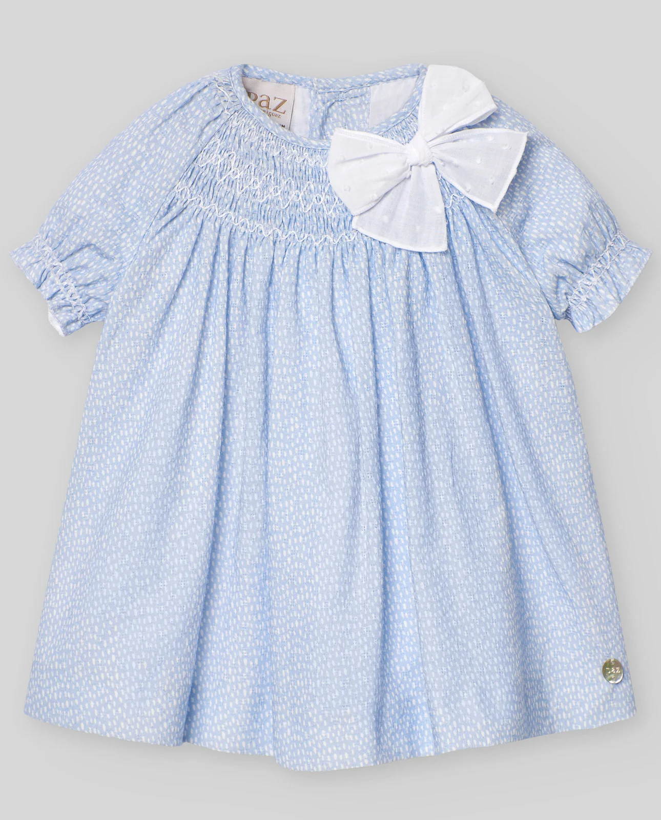 Vestido estampado de manga ranglan con nido de abeja en pechero y puños. Lazada a contraste en plumetti.