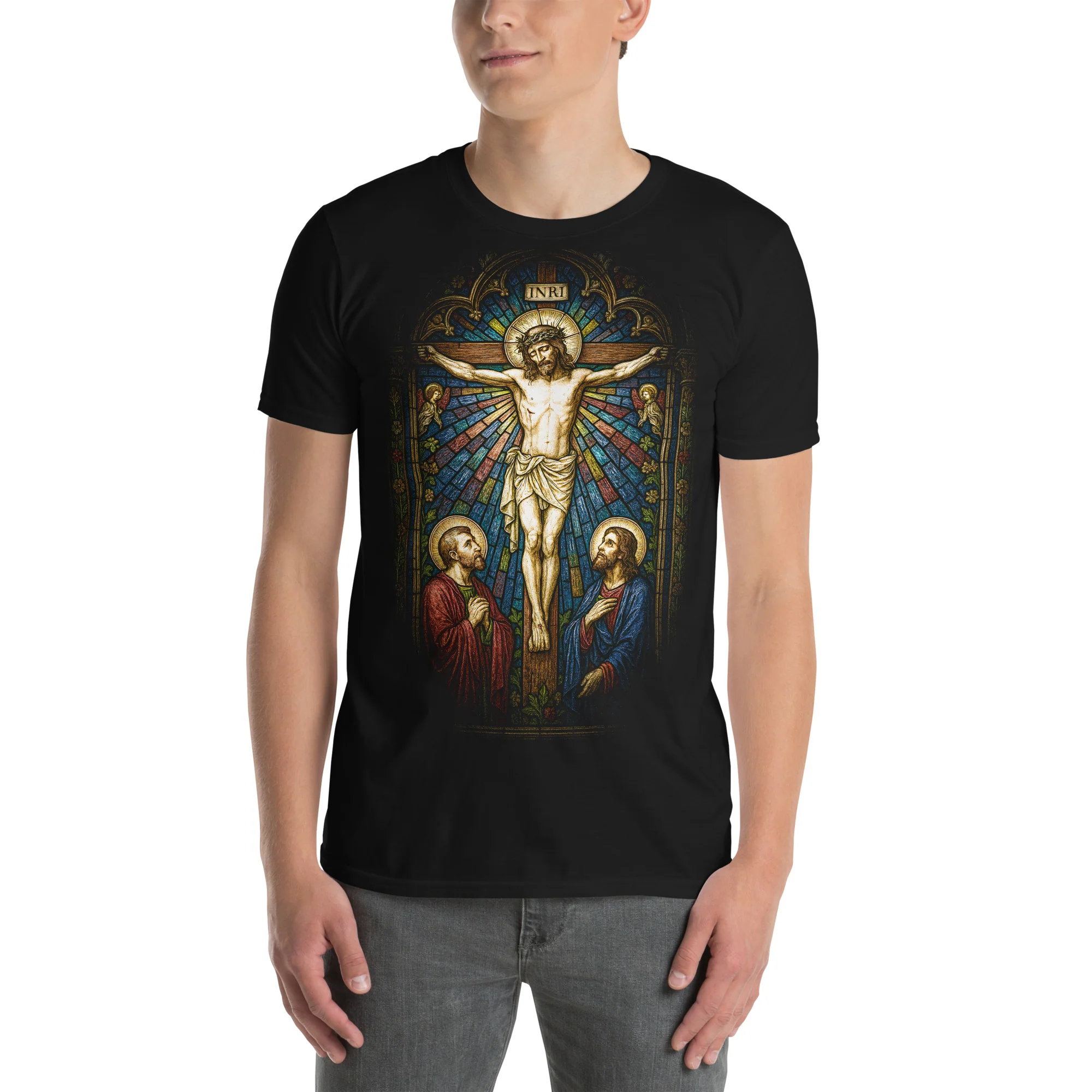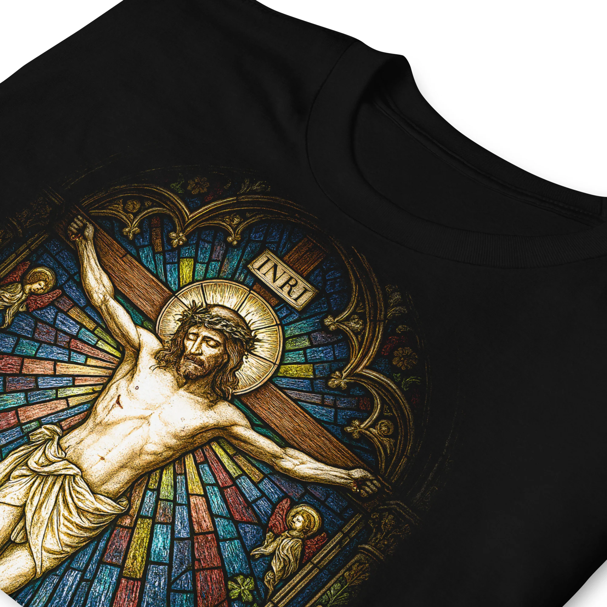Esta camiseta de SO Wear representa una composición tipo vidriera, donde la figura de Jesucristo crucificado se eleva como eje principal, rodeada de una explosión de colores luminosos que simulan el efecto de la luz atravesando un rosetón de catedral.